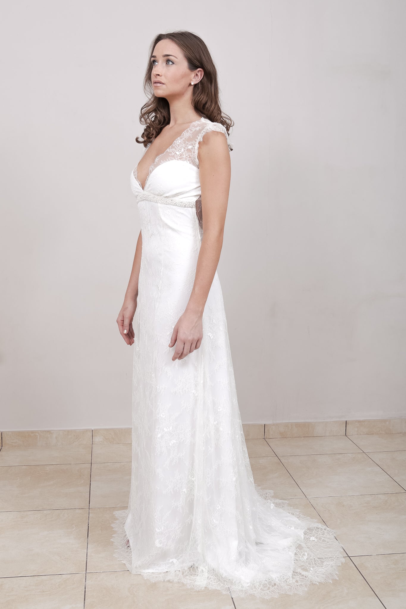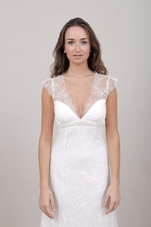 Made from pale ivory Chantilly French lace, with a crepe base layer this dress also features a beaded Pearl and Crystal under bust beaded embellishment.