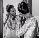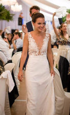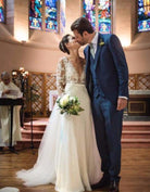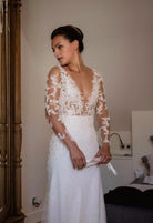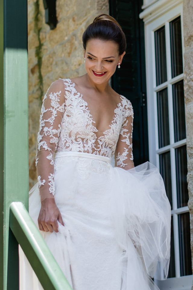 This dress also comes with sheer lace fitted sleeves which are detatchable from the bodice by the use of delicate sheer poppers along the arm hole seam. This option allows a bride to wear the sleeves for the formal ceremony part of the wedding and then remove them for dancing later on transforming the dress from more traditional to a more relaxed look.