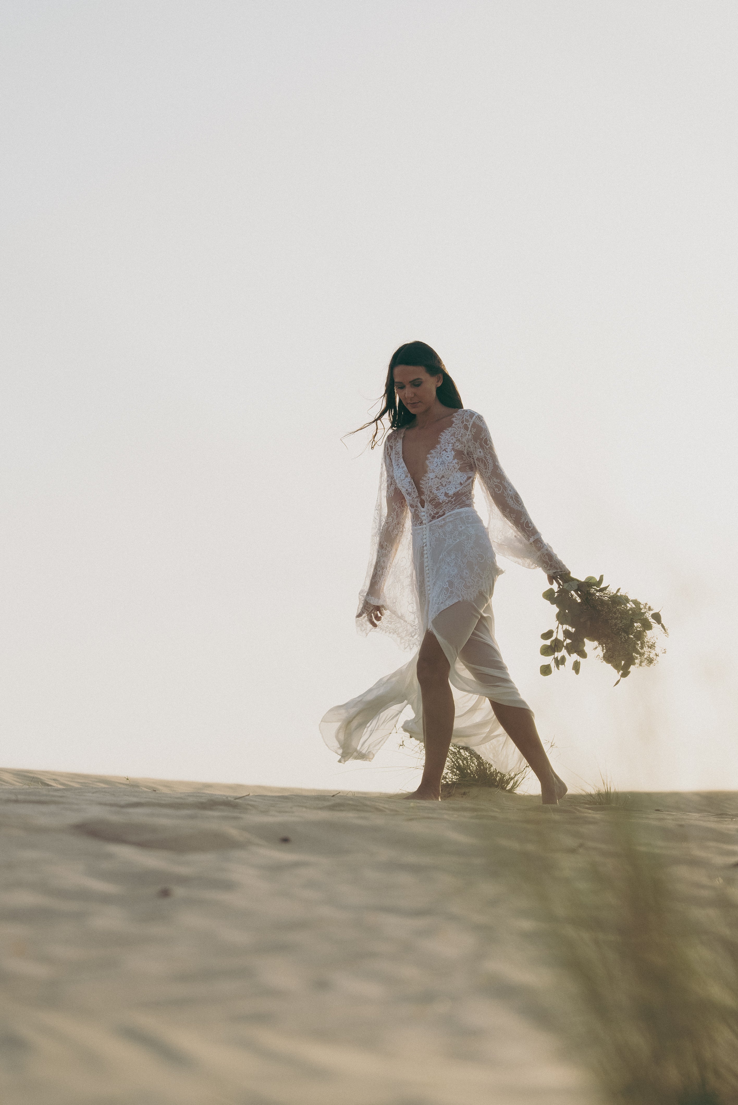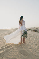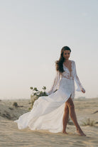 Chantilly lace & Georgette chiffon robe. Long lace sleeves, plunging v neckline to front and back with covered buttons feature fastening down the front. Flowing chiffon sheer skirt with puddle train for extra drama. Built in satin slip skirt.