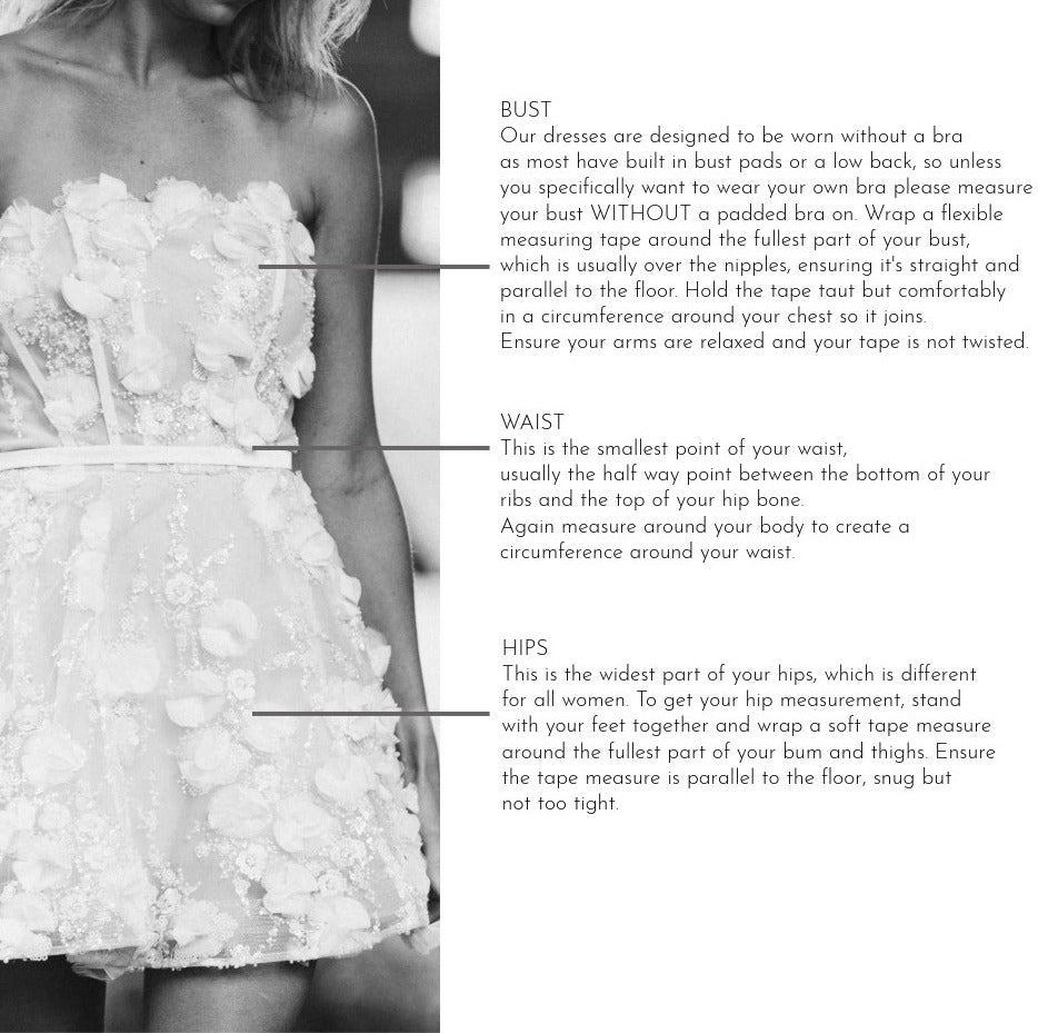 For the most accurate results, we recommend measuring your bust, waist, and hips as shown below. If you are still trying to determine your size, see the chart for international size guidelines.
