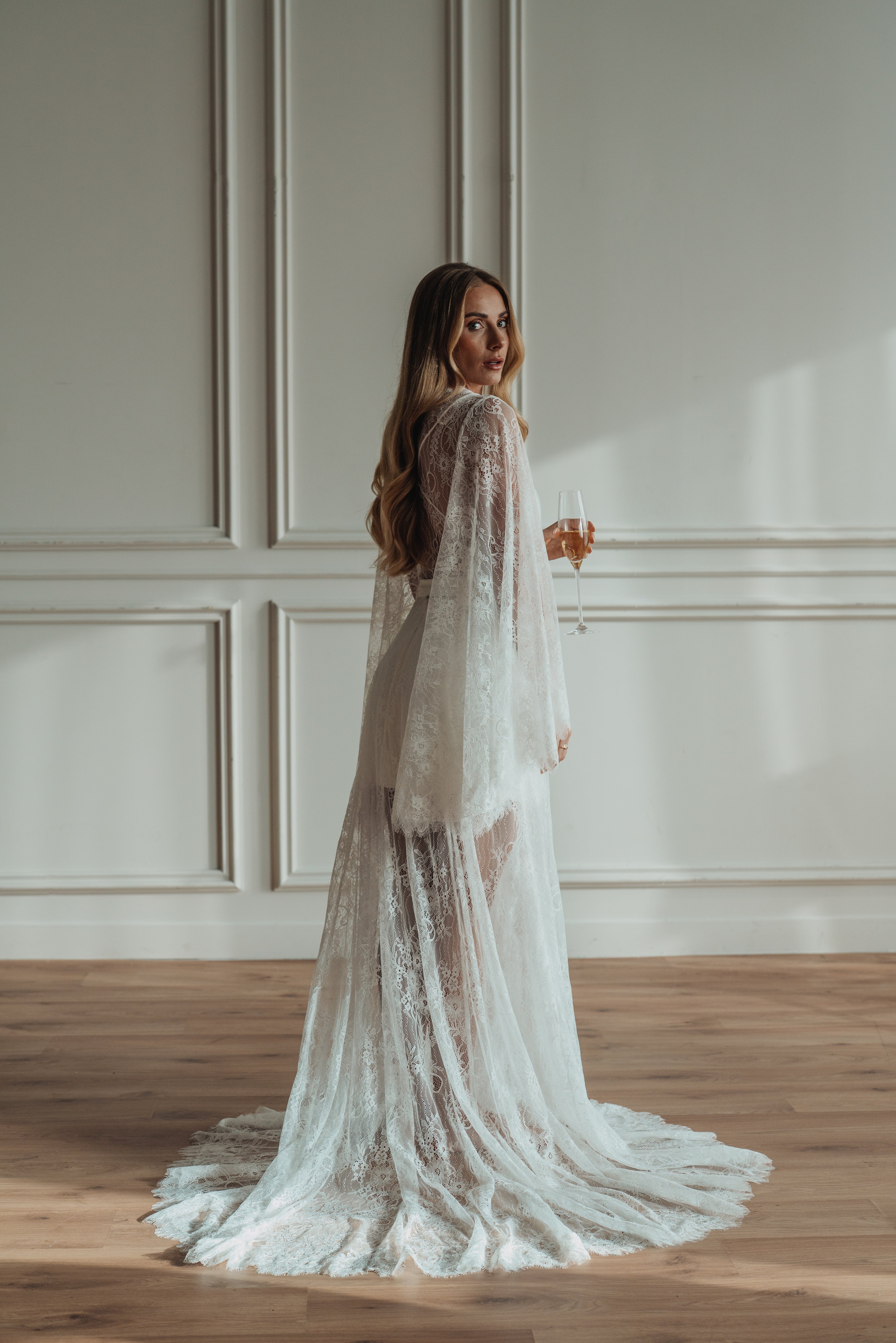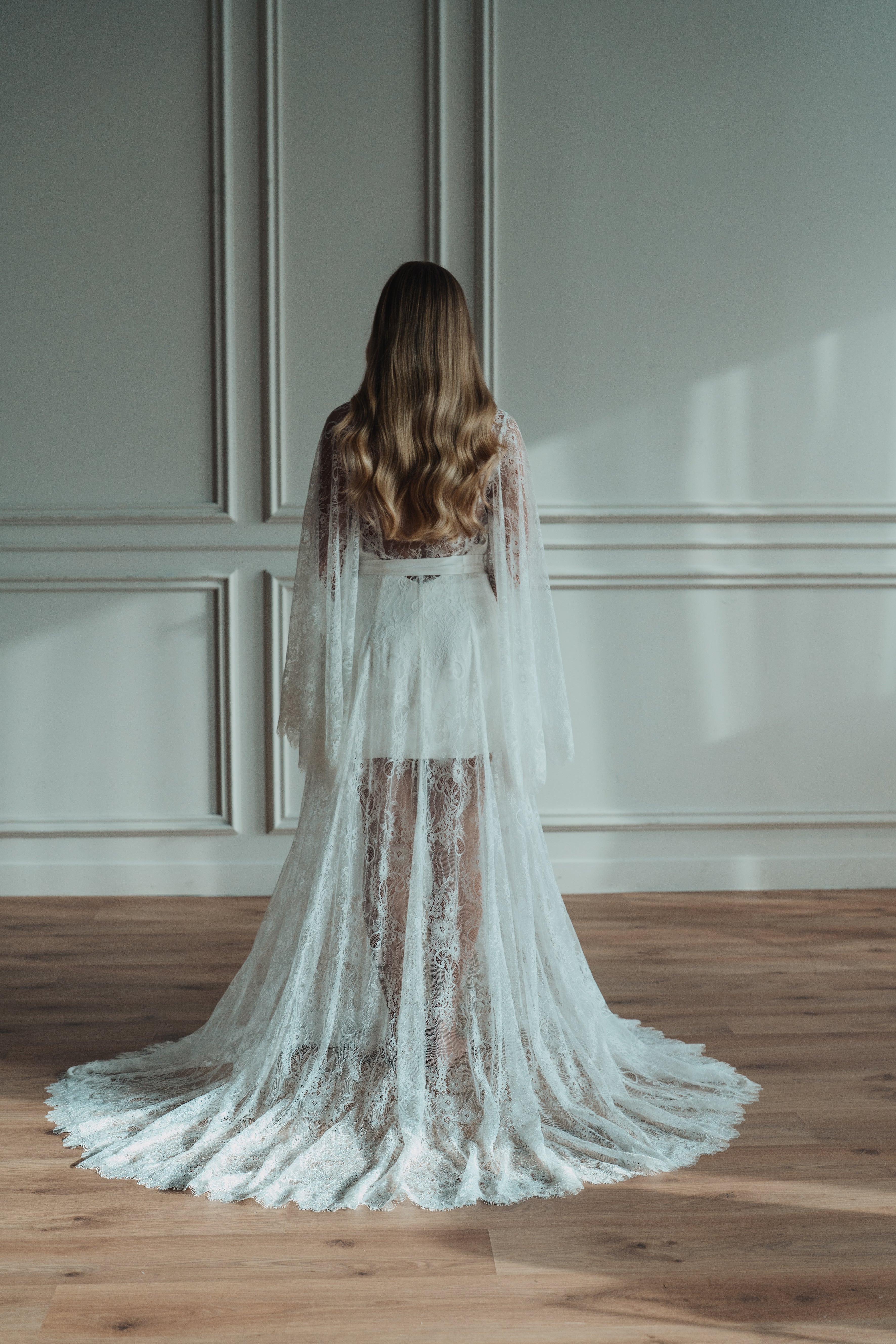 Flowing lace sleeves fall effortlessly from the shoulders. The sheer, floor-length skirt cascades into a soft train, offering drama while maintaining an airy, lightweight feel. Designed to layer over your own lingerie or the satin slip that comes with the robe, this piece is everything you need for the build up to your ceremony.