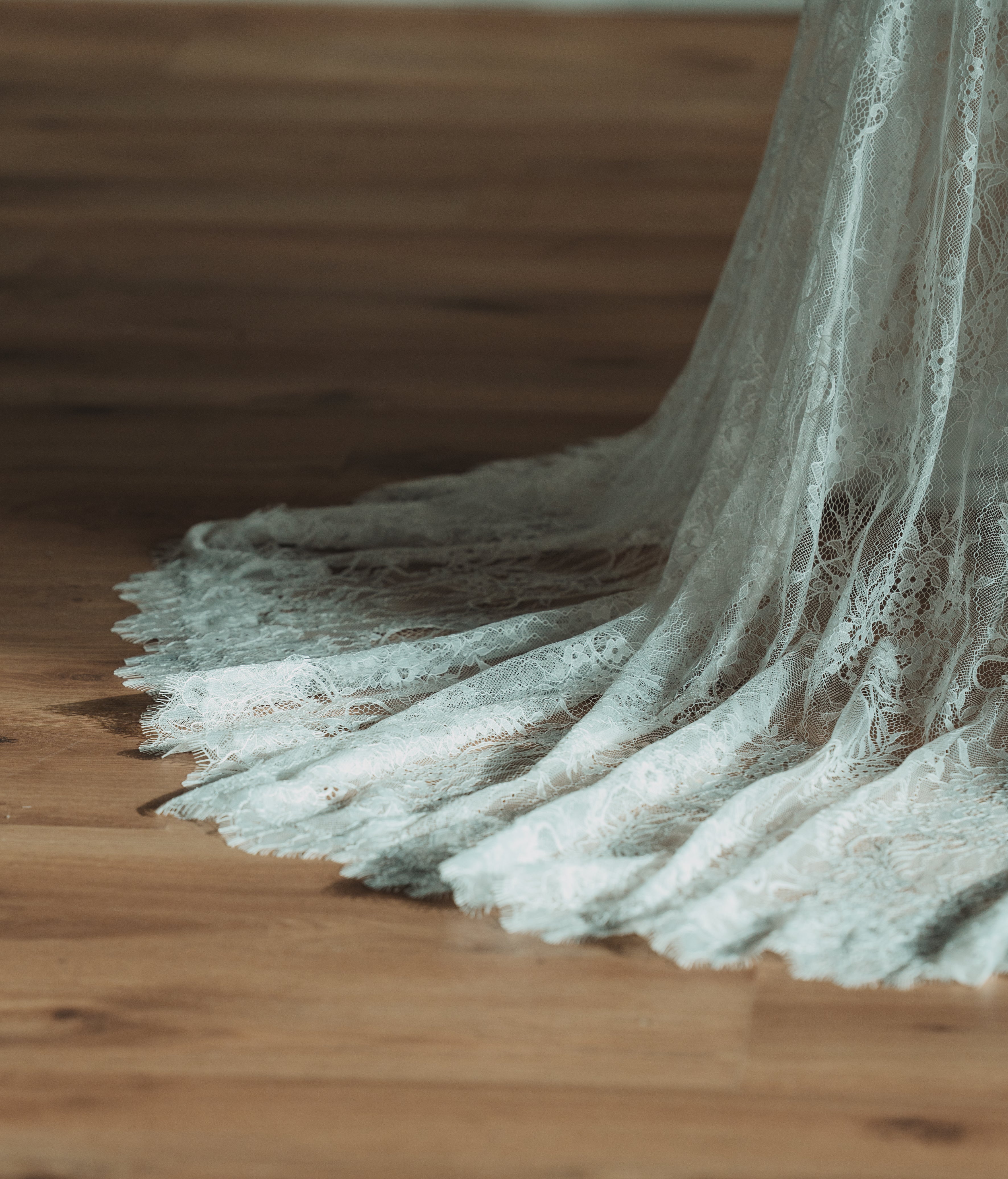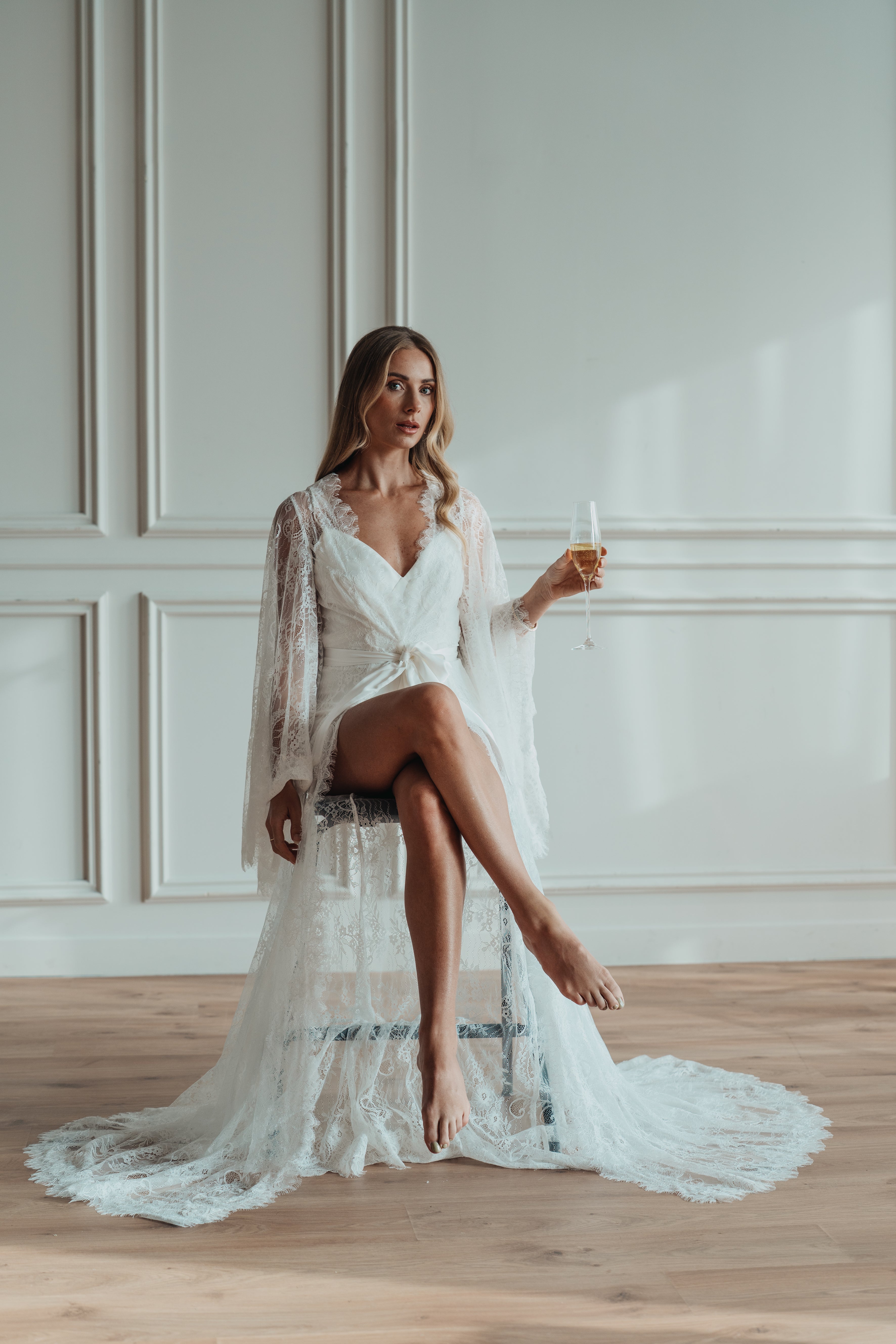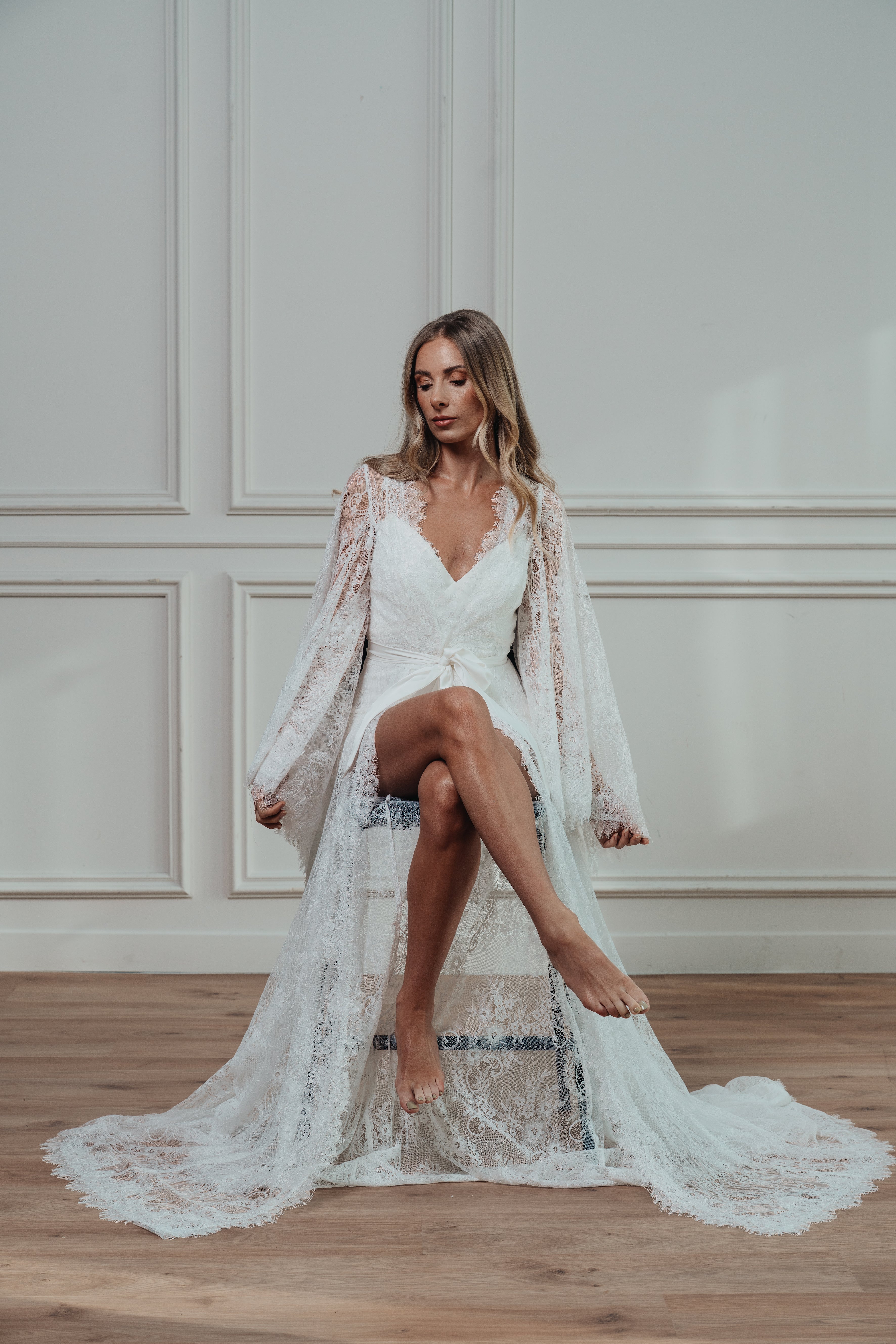 Flowing lace sleeves fall effortlessly from the shoulders. The sheer, floor-length skirt cascades into a soft train, offering drama while maintaining an airy, lightweight feel. Designed to layer over your own lingerie or the satin slip that comes with the robe, this piece is everything you need for the build up to your ceremony.